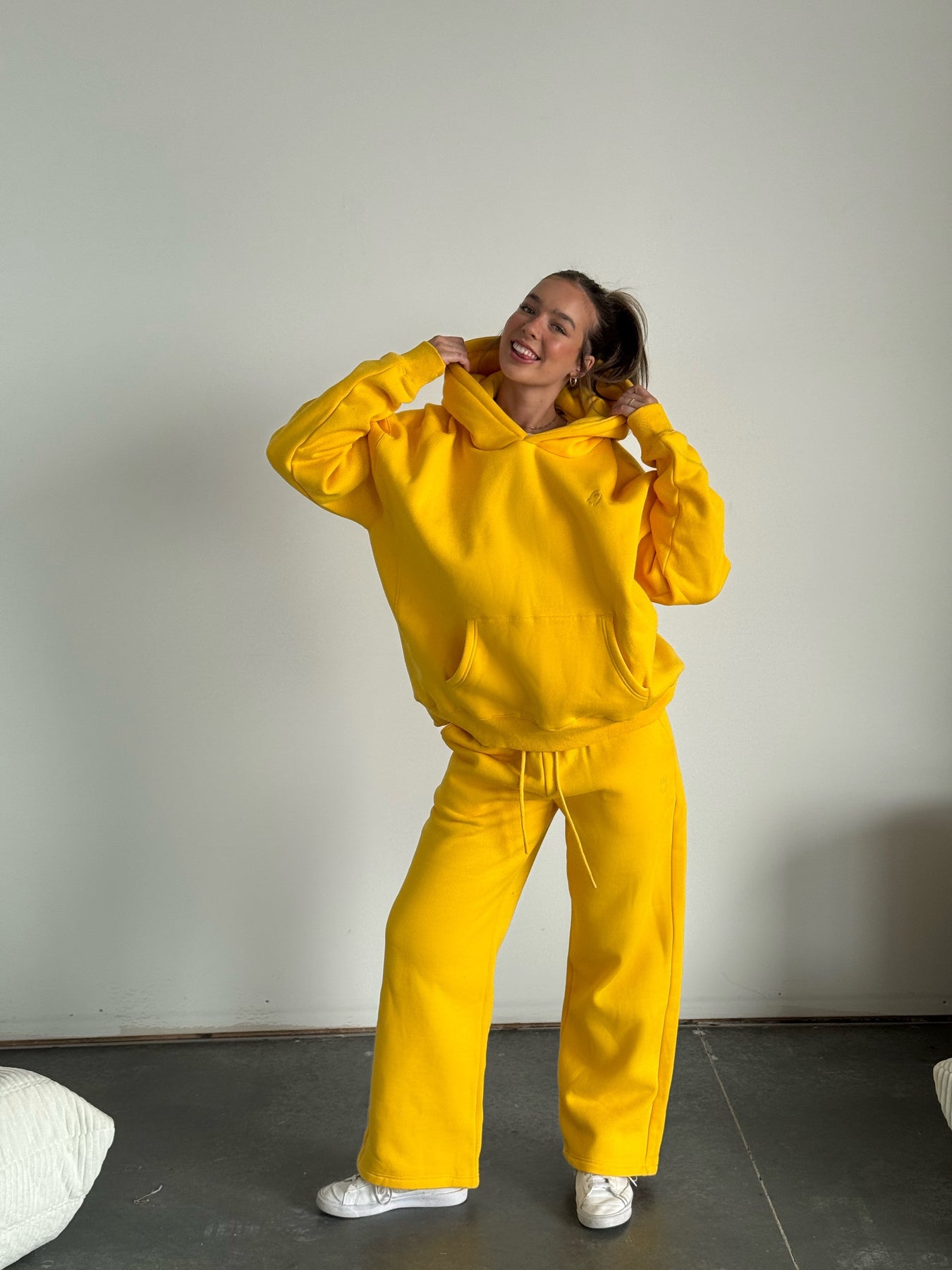 Person wearing a bright yellow hoodie and pants standing indoors against a plain wall.